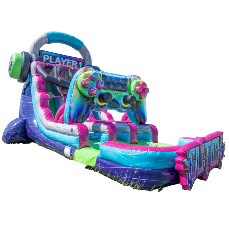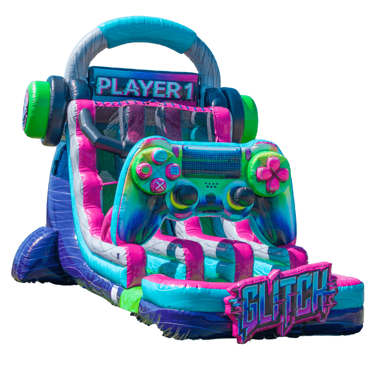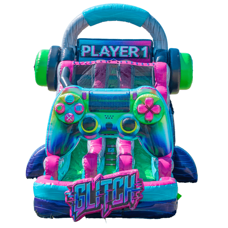 An 18-foot, dual-lane gamer-themed inflatable that lets two riders race side by side on a fast climb-and-slide course. Bright console-style graphics, safety netting, and cushioned walls keep the action fun and secure. Great for birthdays, school events, and backyard parties.